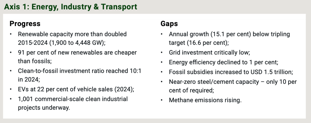 Rapor, küresel iklim eyleminin kritik eksenlerinde ilerleme kaydedildiğini ancak dönüşümün hız ve ölçek açısından hala yetersiz olduğunu ortaya koyuyor ve aşağıdaki tematik alanlarda öne çıkan eğilimlere dikkat çekiyor: