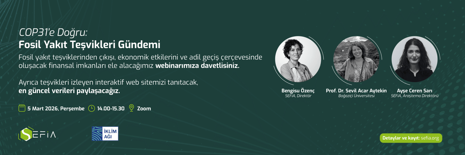 Sürdürülebilir Ekonomi ve Finans Araştırmaları Derneği (SEFiA) olarak, iklim müzakerelerinde önemli tartışmalardan biri olan fosil yakıt teşviklerinde güncel durumu, makroekonomik etkilerini, çıkış planlamasını ve teşviklerden çıkılmasıyla ortaya çıkacak yeni finansal imkanların ‘adil geçiş’ perspektifinden nasıl kullanıma alınabileceğini konuşacağımız webinarımıza tüm paydaşlarımızı davet ediyoruz.